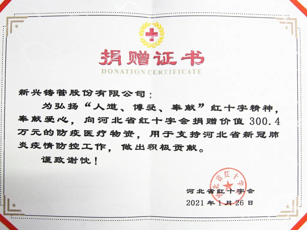 河北省紅十字會向公司發(fā)來捐贈證書及感謝信